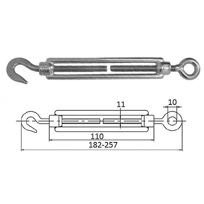Талреп типа "рым-гак"- предназначен для регулирования натяжения проводов, кабелей, тросов и др. Механизм используется для регулировки оси, коррекции уровня натяжения, увязывания. Основные элементы талрепа это: тело талрепа и концевые элементы. Винтовой механизм позволяет ослабить или натянуть трос.